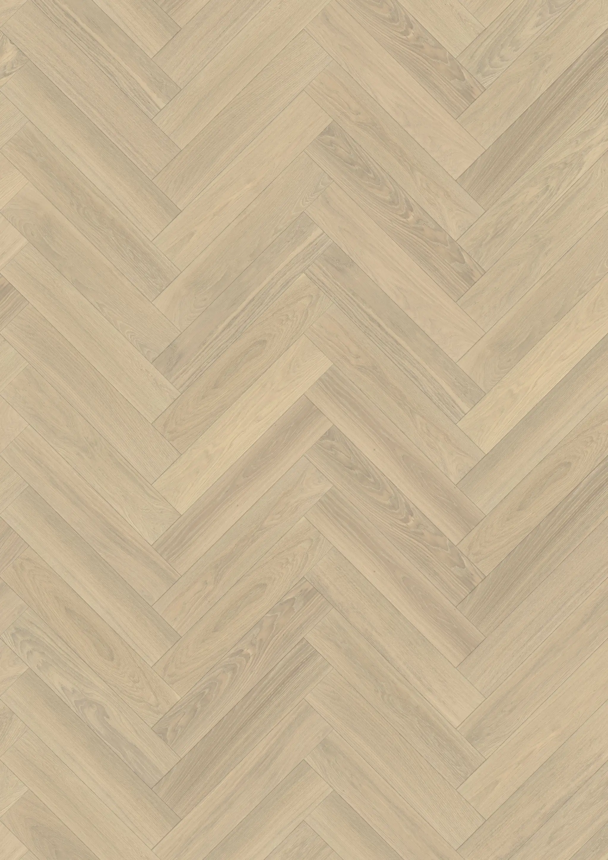 Oak Herringbone AB Crème White is a premium 2-layer parquet flooring crafted from carefully selected oak, featuring moderate colour variations and few knots. Each bundle includes both left and right hand boards for a glue-down herringbone installation. The generous dimension of each board is highlighted by four-sided micro-bevelling, while the brushed and oiled finish enhances the wood’s natural grain and texture.