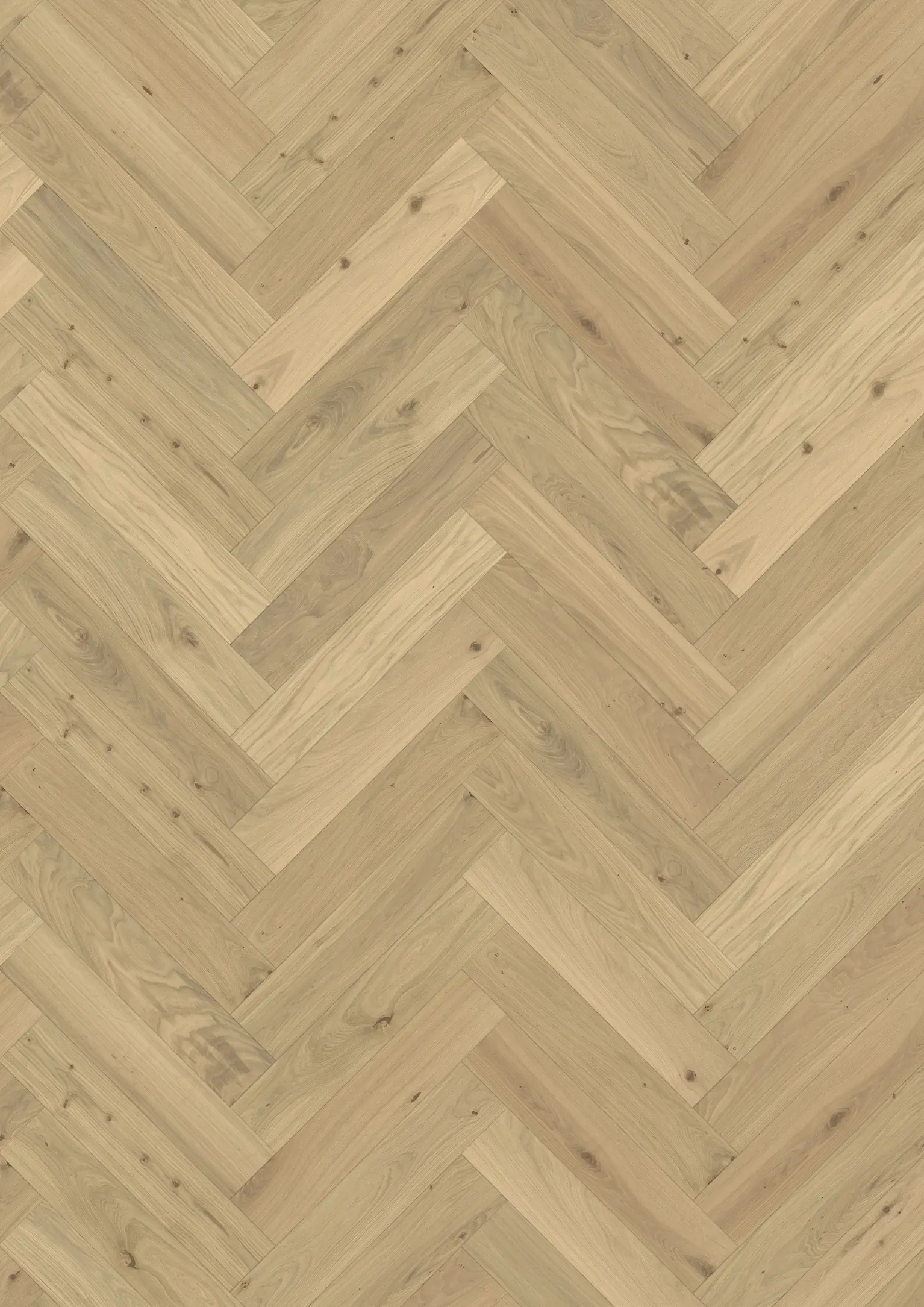 Oak Herringbone CC Dim white is a premium 2-layer parquet crafted from European oak, featuring colour variations and knots. Each bundle includes both left and right boards for a glue-down herringbone installation. The generous dimension is highlighted by four-sided micro-bevelling, while the brushed and dim white oiled finish enhances the wood’s natural grain and texture.
